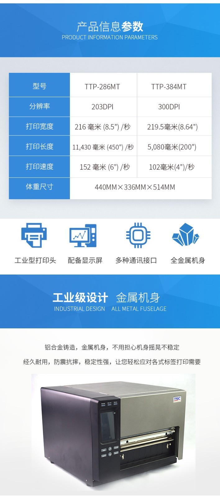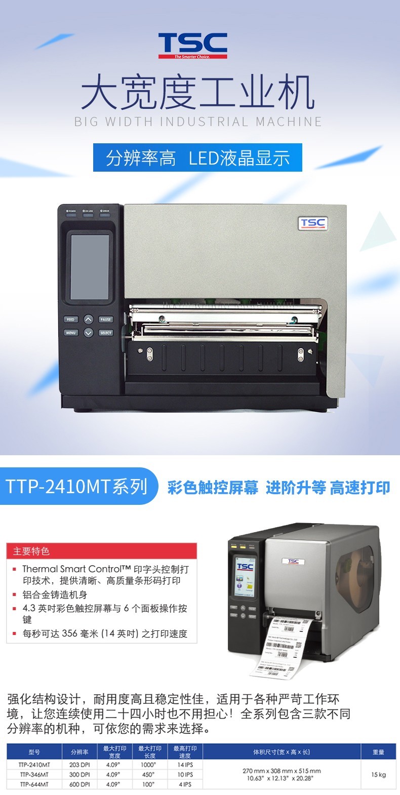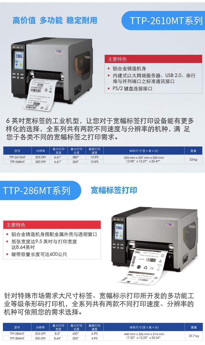TSC有30多個系列,近百個機型的專業(yè)條形碼打印產(chǎn)品,種類涉及桌面型、工業(yè)型、便攜型、列印模組以及彩色打印,是目前所有品牌中產(chǎn)品較為齊全的制造廠商,可滿足各種行業(yè)的使用需求。
